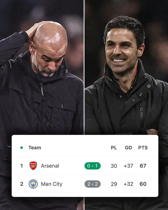 虎扑03月05日讯 英超第29轮,阿森纳客胜布莱顿,曼城战平森林,积分榜上,阿森纳多赛一轮领先曼城7分。