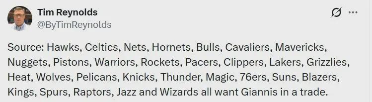 随着字母哥炮轰队友一事发生,关于他的交易传闻再度不绝于耳,美联社知名记者Tim Reynolds对此表示其余29支球队都有意将其收入麾下。